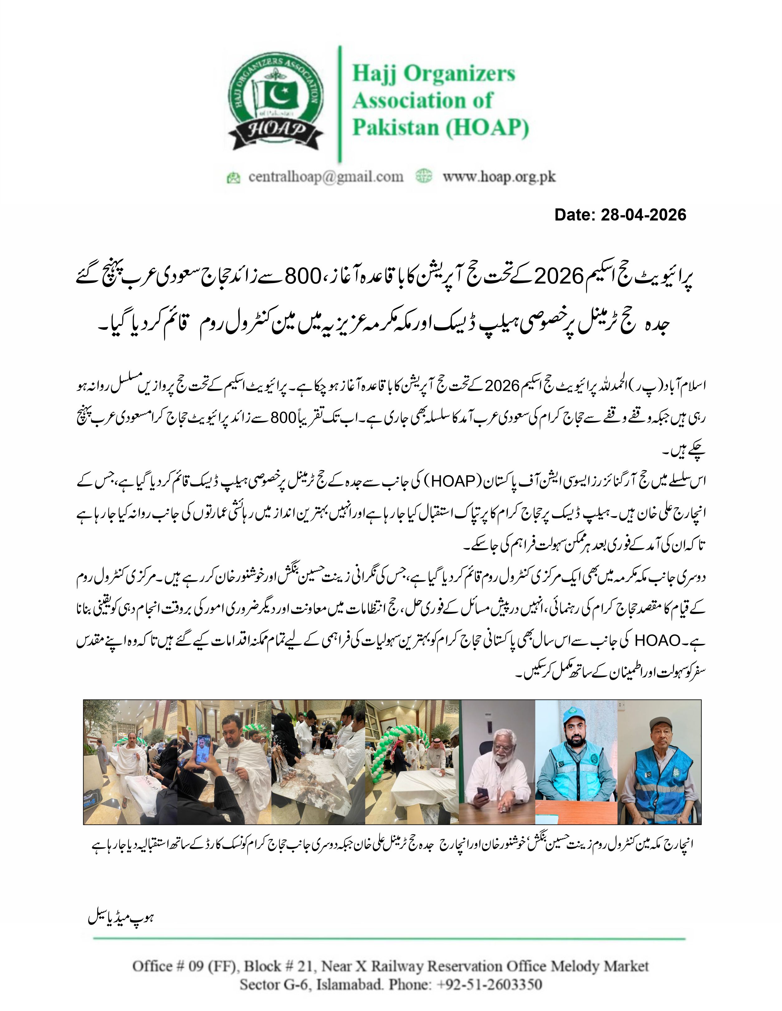 Hajj Organizers Association of Pakistan (HOAP) is the representative body of registered 741 HGOs of Pakistan handling 50% of total Hajj Quota of Pakistani which cover 71,461 Hujjjaj Pakistan.