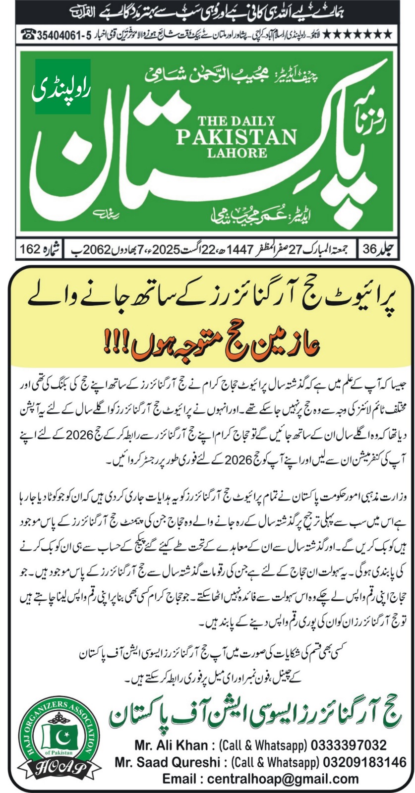 Hajj Organizers Association of Pakistan (HOAP) was founded in Month of May 2005 by the HGO’s registered with Ministry of Religious Affairs Government of Pakistan.