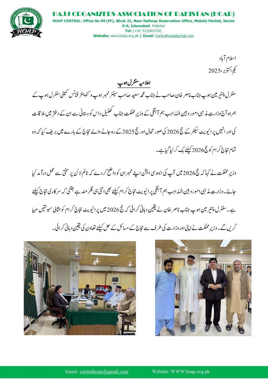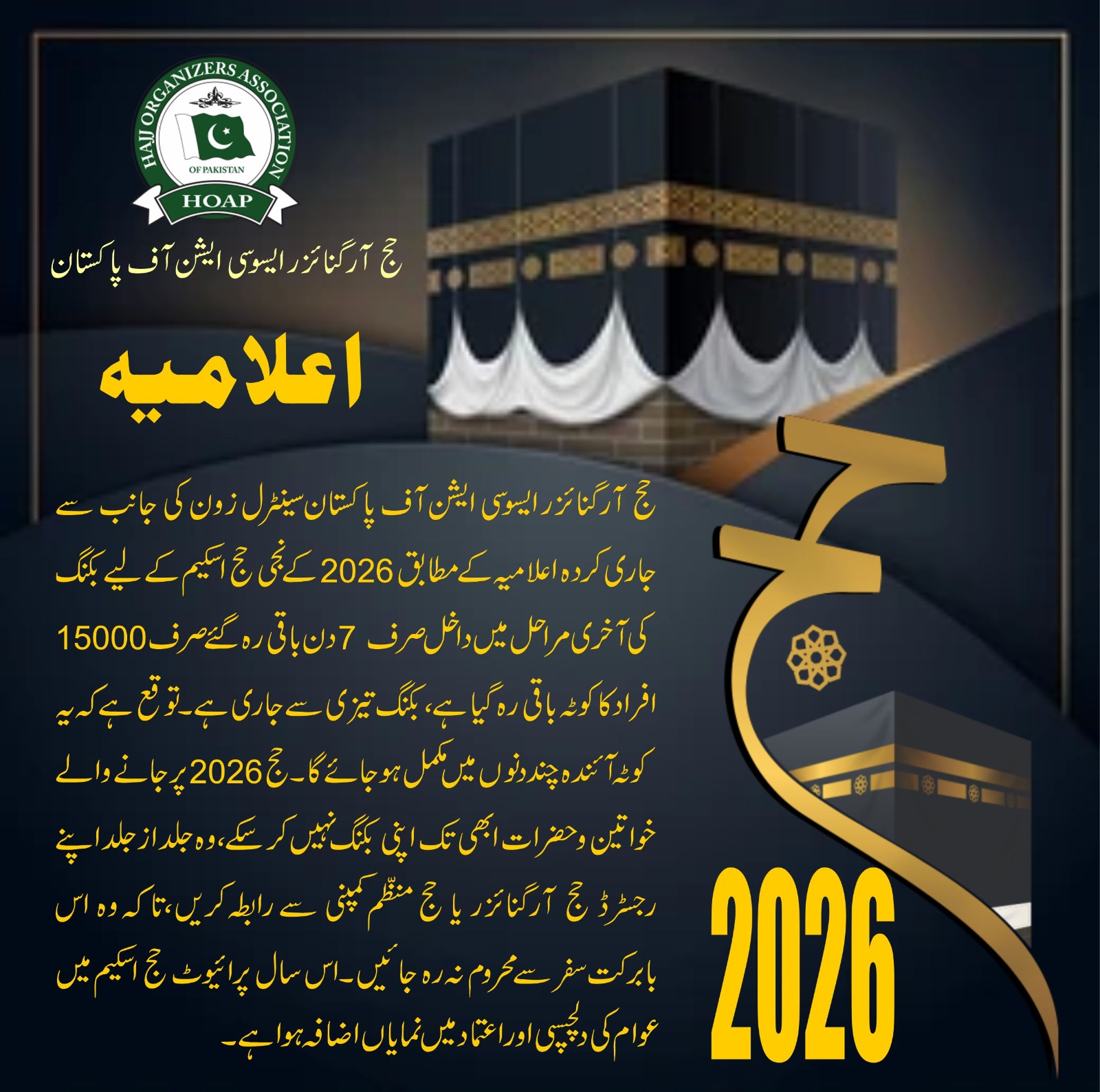 Hajj Organizers Association of Pakistan (HOAP) is the representative body of registered 741 HGOs of Pakistan handling 50% of total Hajj Quota of Pakistani which cover 71,461 Hujjjaj Pakistan.