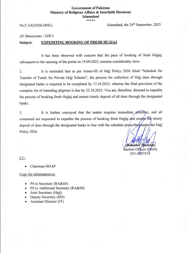 - To maintain close coordination with Saudi Hajj Authorities i.e. Saudi Wizarat-e-Hajj, Moassisa South Asia, NAQABA , Maktab-Ul-Wakala and other international organizational setups of Hujjaj.